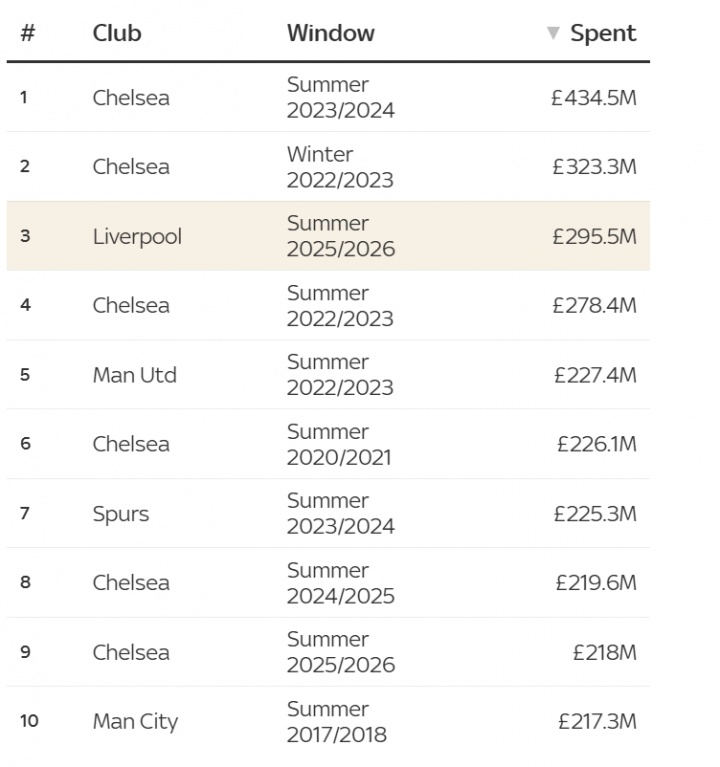 利物浦还花了2.95亿英镑在历史上排名第三 而切尔西则以4.34亿英镑排名第一